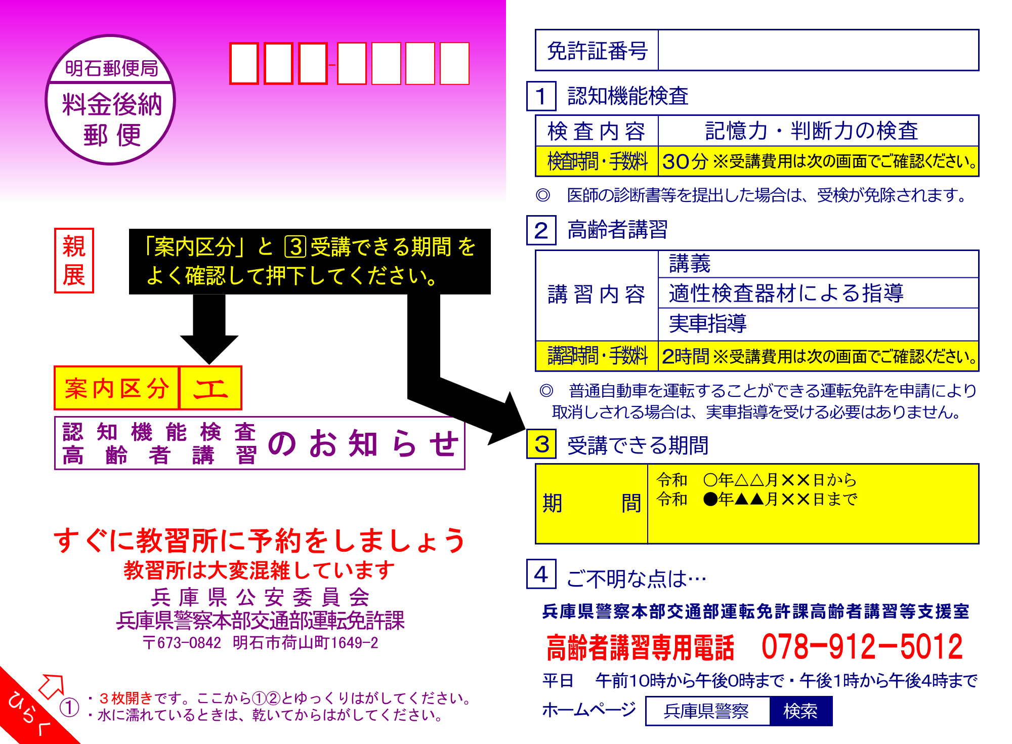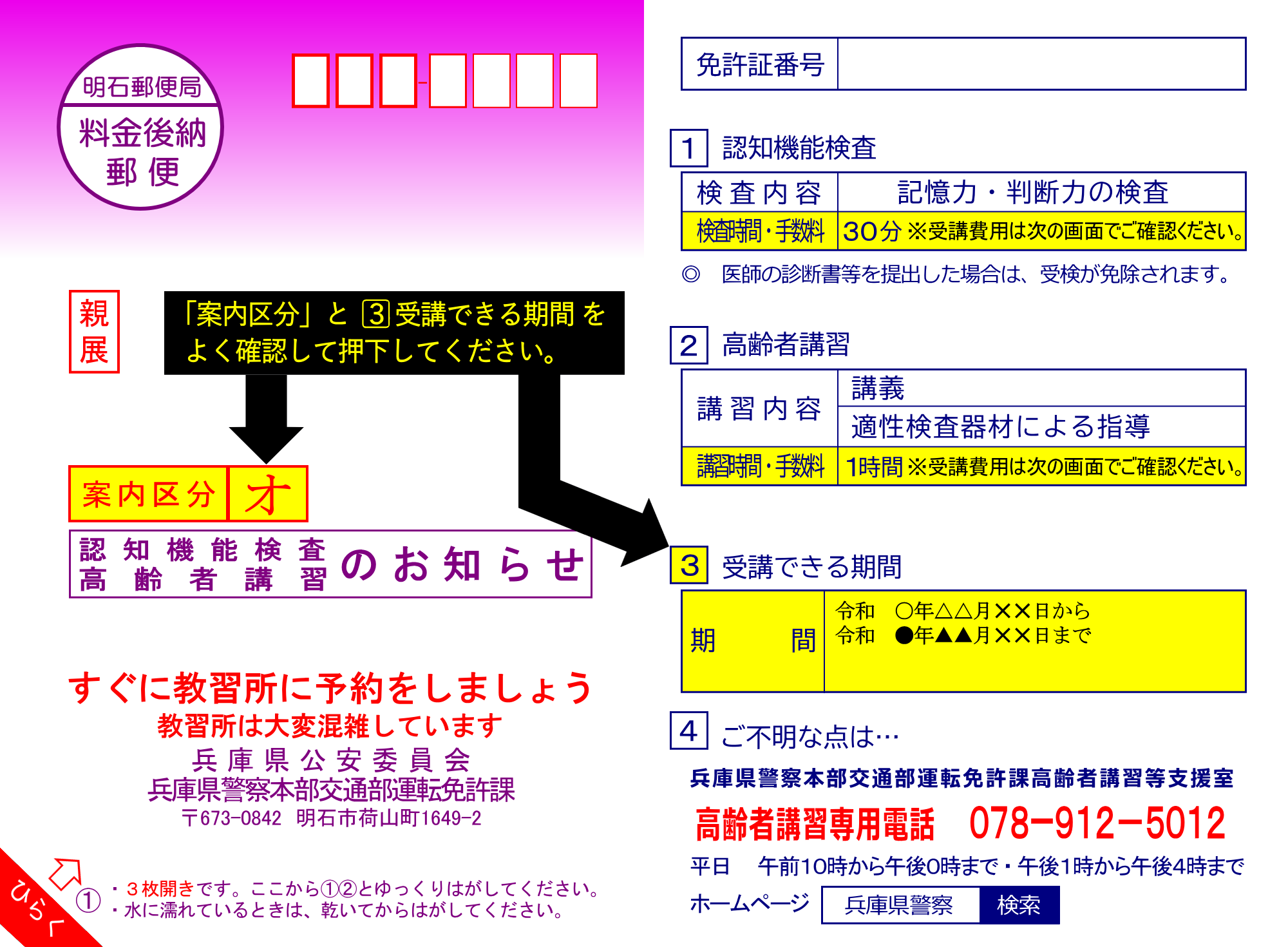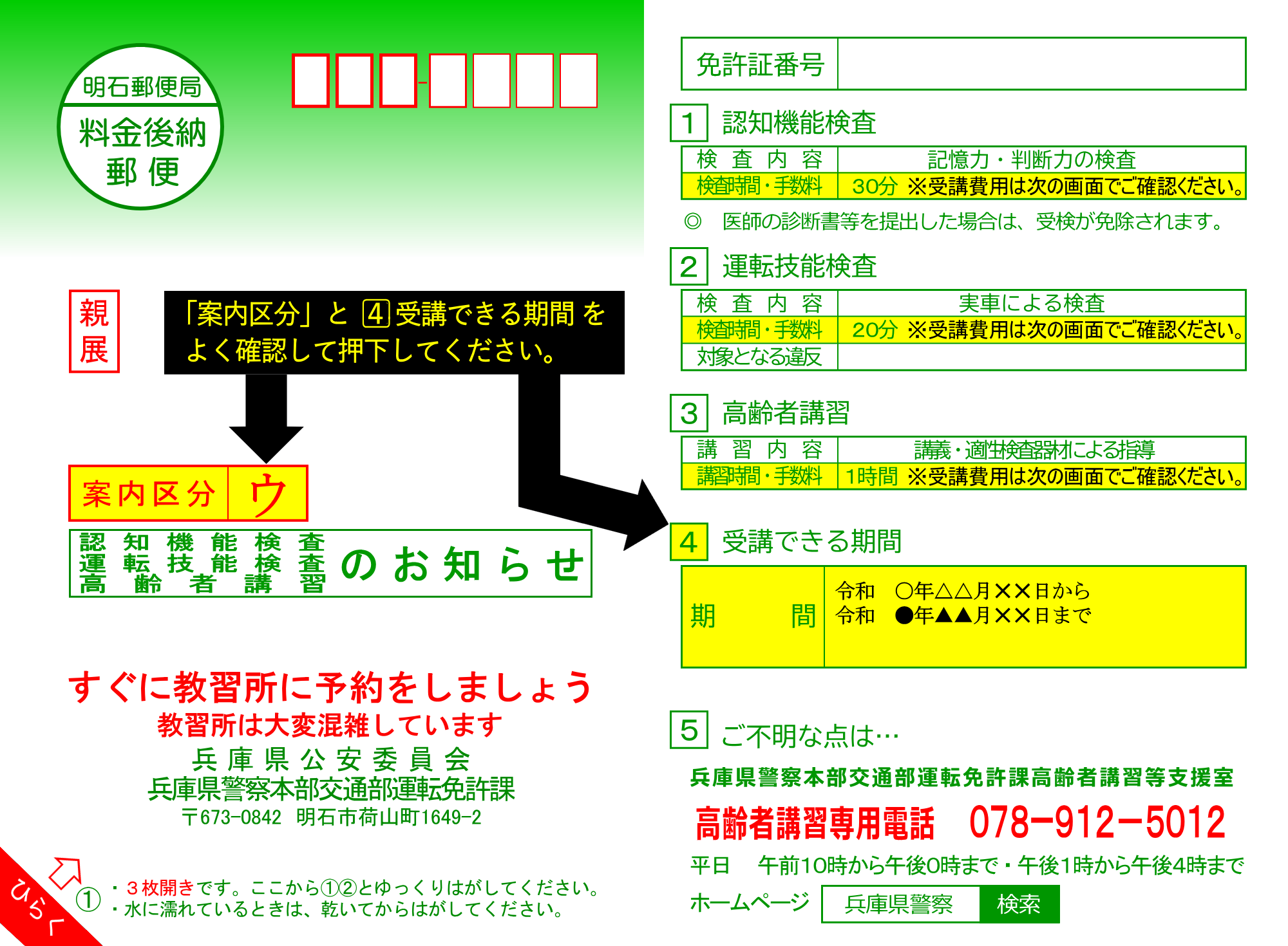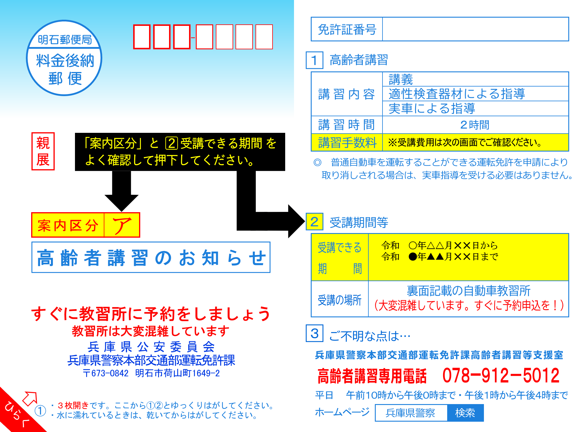 高齢者講習予約フォーム / elderly class reservationn 「高齢者講習のお知らせ」のハガキと同じ「案内区分」のものを下から選んでください。ハガキの画像を押下すると受講日時の選択画面へ移行します。 案内区分「ア」 案内区分「イ」 案内区分「ウ」 案内区分「エ」 案内区分「オ」 案内区分が分からない方 ハガキを紛失された方は、下記の窓口に電話して「案内区分」を確認してください。 兵庫県警察本部交通部運転免許課高齢運転者等支援室 高齢者講習専用電話078-912-5012 平日午前10時から午後0時まで・午後1時から午後4時まで 「高齢者講習のお知らせ」のハガキと同じ「案内区分」のものを下から選んでください。ハガキの画像を押下すると受講日時の選択画面へ移行します。 案内区分「ア」 案内区分「イ」 案内区分「ウ」 案内区分「エ」 案内区分「オ」 案内区分が分からない方 ハガキを紛失された方は、下記の窓口に電話して「案内区分」を確認してください。 兵庫県警察本部交通部運転免許課高齢運転者等支援室 高齢者講習専用電話078-912-5012 平日午前10時から午後0時まで・午後1時から午後4時まで