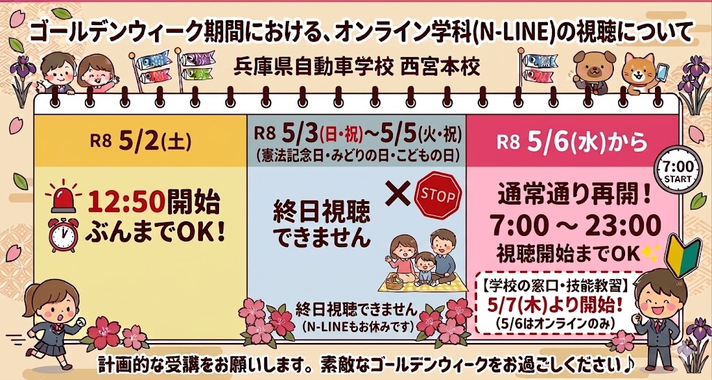 ゴールデンウィーク期間における、オンライン学科の視聴について Posted on 2026年4月10日 by driving-school-nishinomiya_kanri ゴールデンウィーク期間の休校に伴い、以下の期間、オンライン学科の受講ができなくなります。