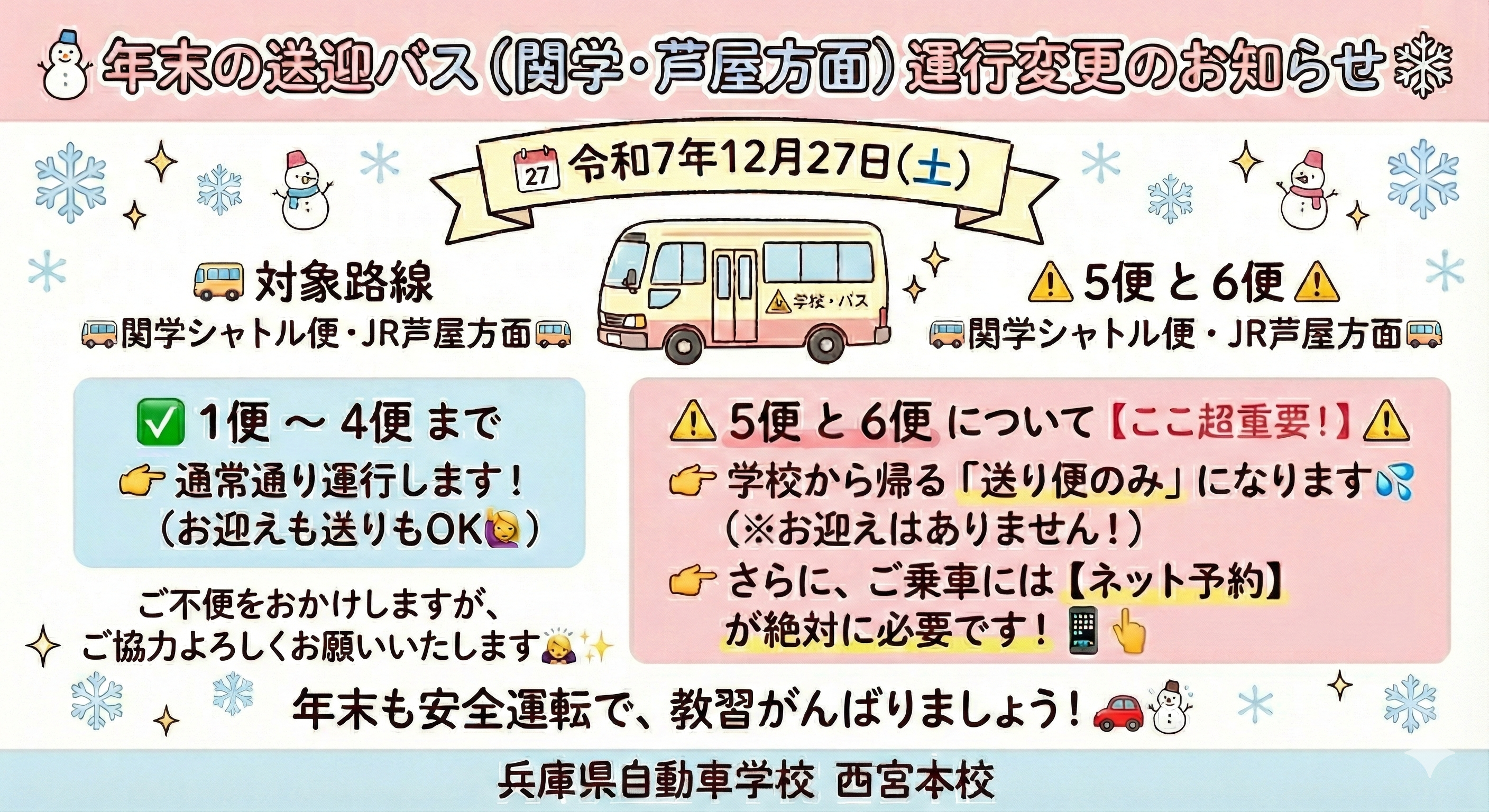 年末の送迎バス、運行変更のお知らせ
