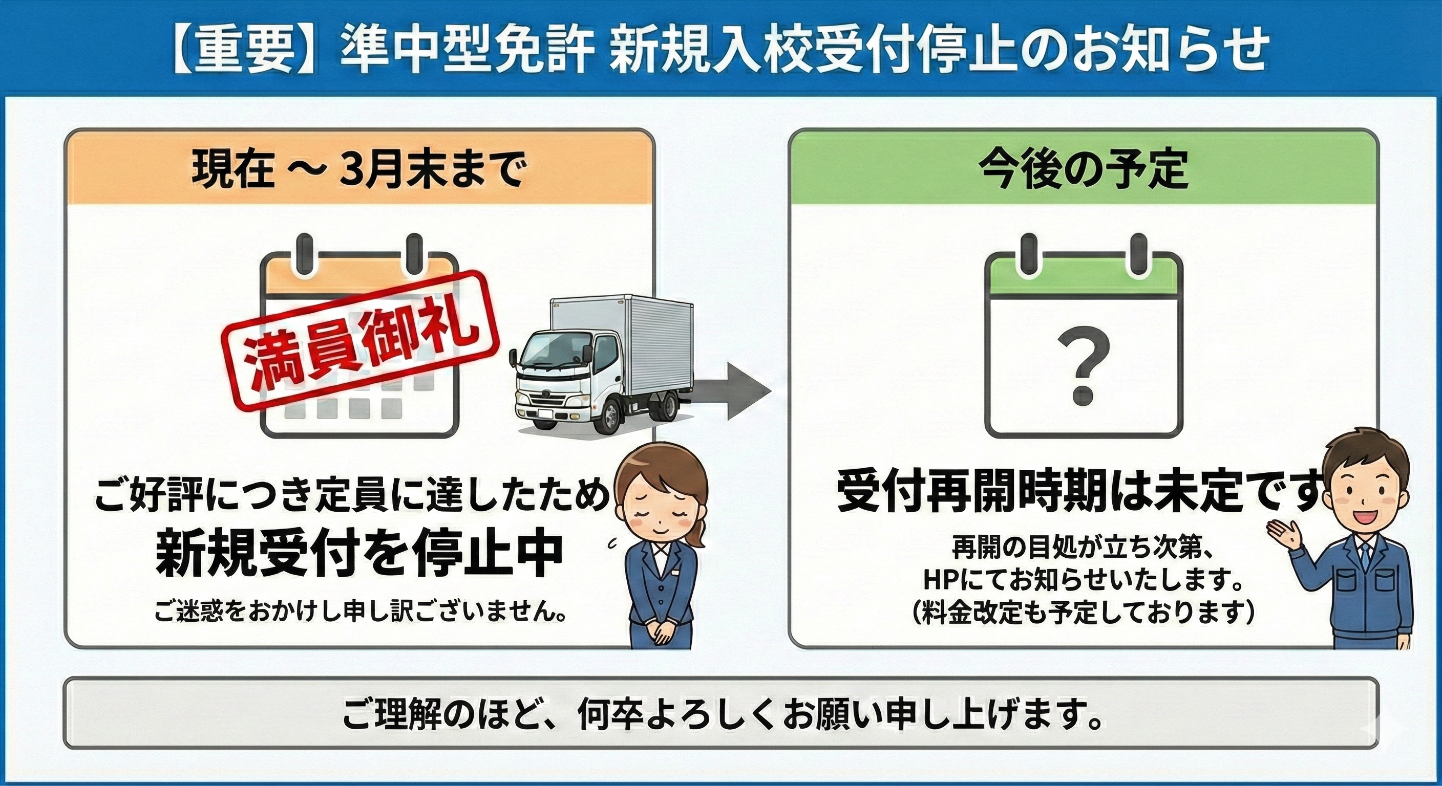 準中型免許、新規受付一時中止のお知らせ
