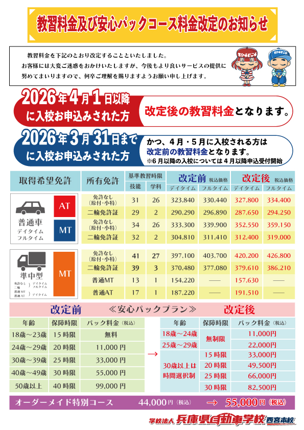 料金改定および入校受付に関するお知らせ Posted on 2026年2月27日2026年2月27日 by driving-school-nishinomiya_kanri 2026年4月1日より、料金体系を改定させていただくこととなりました。 あわせて、休止しておりました「オーダーメイドコース」の受付を再開いたします。 ・旧料金の適用について 3月末までにお申し込みいただき、5月末までに入校される場合は、改定前の料金を適用いたします。 ・オーダーメイドコースについて 4月・5月入校分の受付を再開いたしました。 ・6月以降の入校受付について 通常プラン・オーダーメイドコース共に、4月1日より受付を開始いたします。 詳細につきましては、下記をご覧ください。